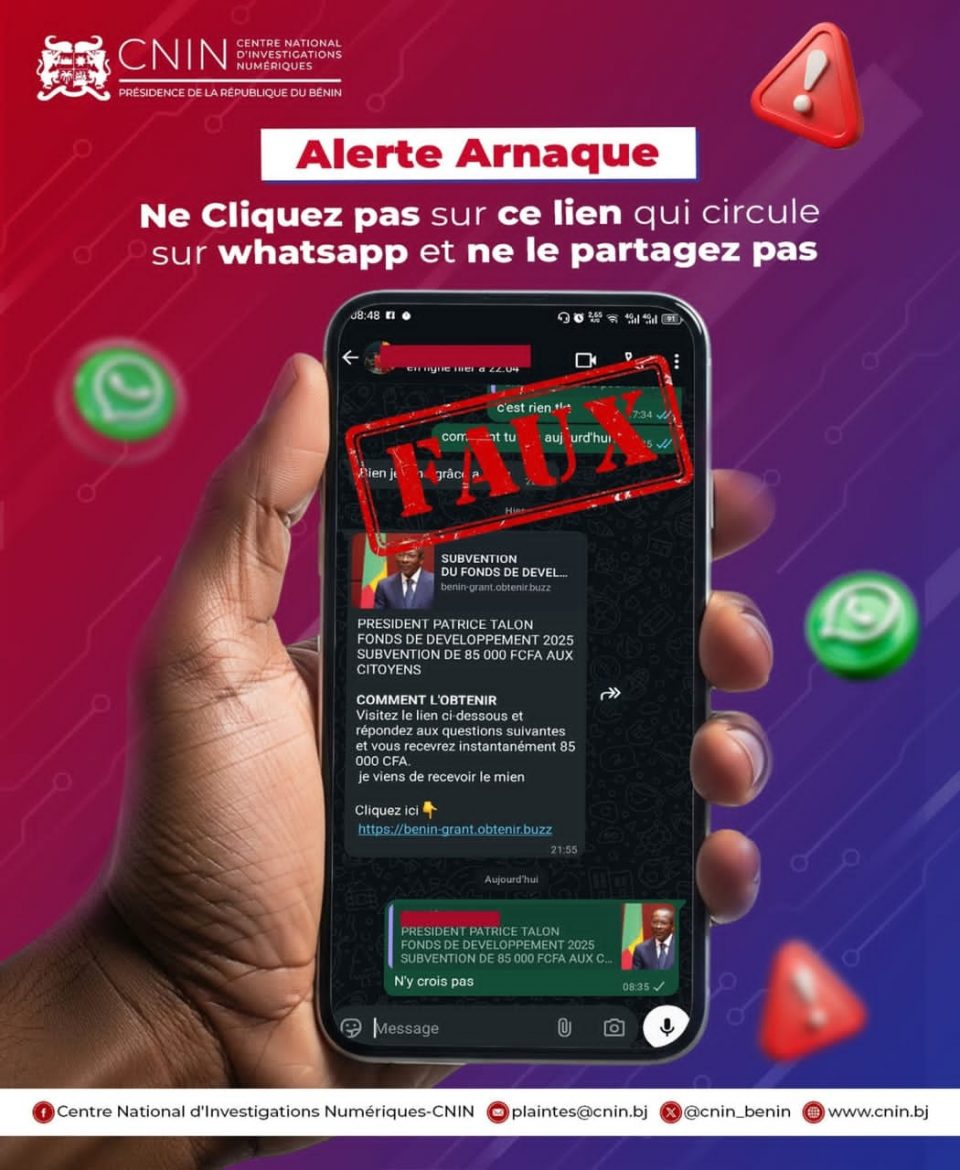 Le Centre National d’Investigations Numériques (CNIN) alerte la population contre un lien frauduleux en circulation sur WhatsApp. Ce lien renvoie à un formulaire selon lequel, il est promis une prétendue aide financière, de la part du président Patrice Talon. Il s’agit d’une arnaque. Les citoyens sont invités à ne pas cliquer, à ne fournir aucune information personnelle et à ne pas partager le lien.