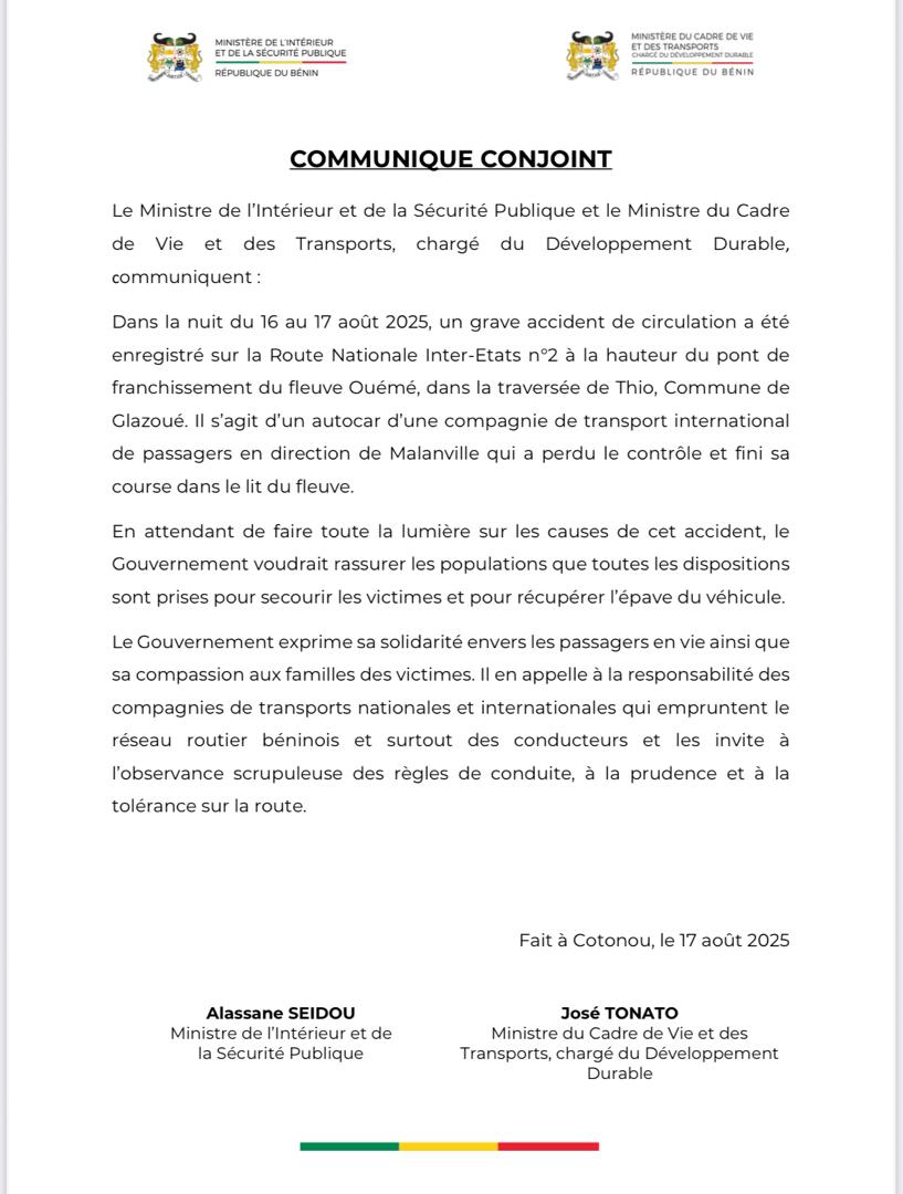Une alerte bip info! Un bus d'immatriculation malienne est tombé dans le fleuve Ouémé dans la nuit de ce samedi à dimanche 17 août 2025 sur l'axe Savè- Glazoué.   Selon les premières informations recueillies par Bip radio à 1h30 mn ce dimanche, 7 passagers ont pu s'échapper et ont été évacués à Savè par la police et des témoins.   Le bus est complètement immergé avec le […]